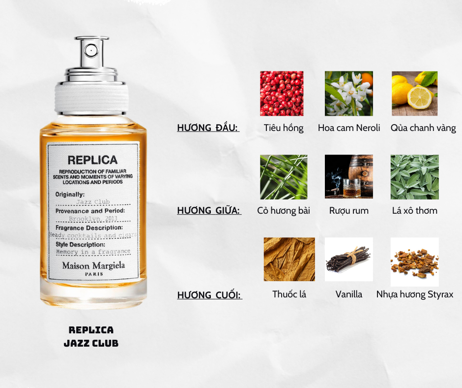 Chai nước hoa Replica Jazz Club từ Maison Margiela mang đến một trải nghiệm hương thơm đầy lôi cuốn, gợi nhớ đến không khí sang trọng và quyến rũ của một câu lạc bộ jazz. Dưới đây là sự phân tích chi tiết các nốt hương đặc trưng của sản phẩm: