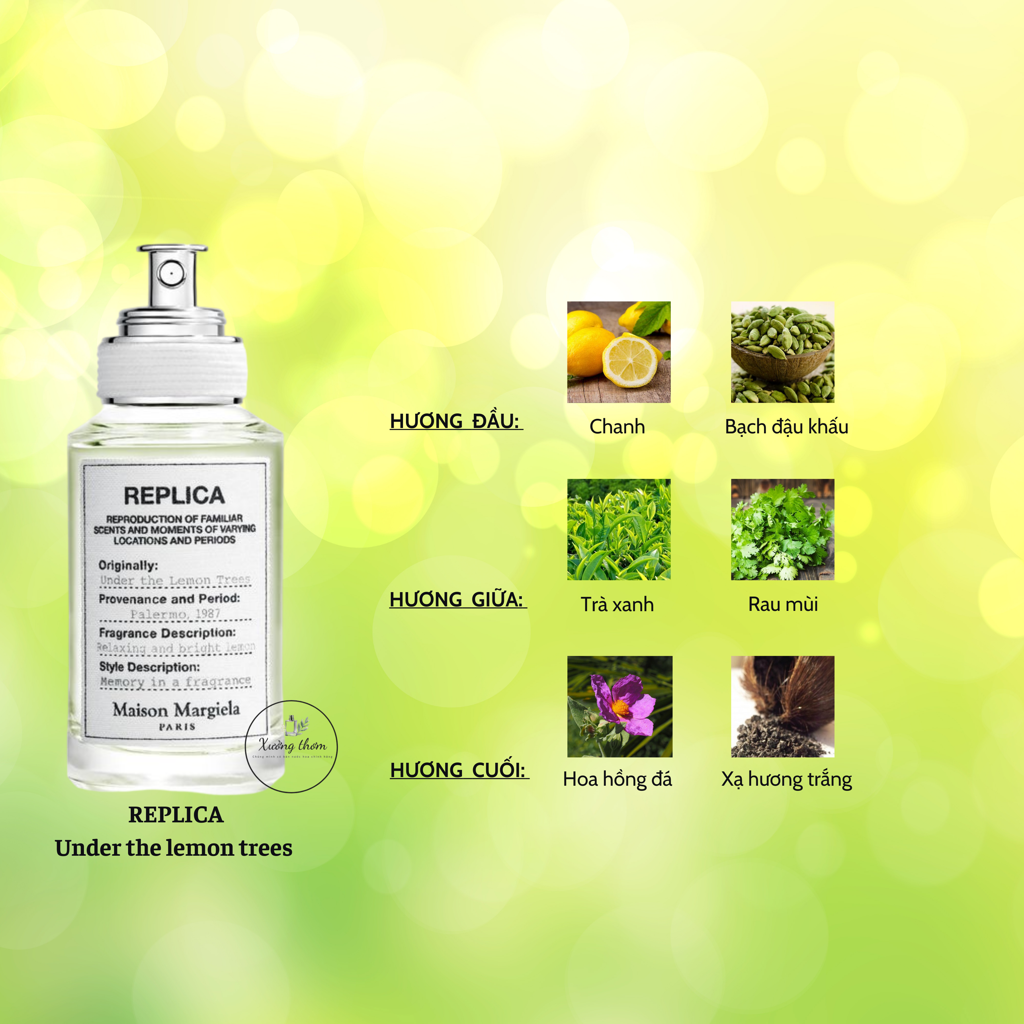 Cuối cùng là xạ hương trắng nhẹ nhàng và hương hoa hồng đá tạo thêm chiều sâu cho nước hoa, mang lại sự cân bằng hoàn hảo giữa sự tươi mới và sự ấm áp. Replica Under the Lemon Trees không chỉ là một sự lựa chọn tuyệt vời cho những ai yêu thích sự thanh thoát và tự nhiên, mà còn là một món quà lý tưởng cho bất kỳ ai muốn mang theo cảm giác của một buổi chiều mùa hè rực rỡ suốt cả ngày.