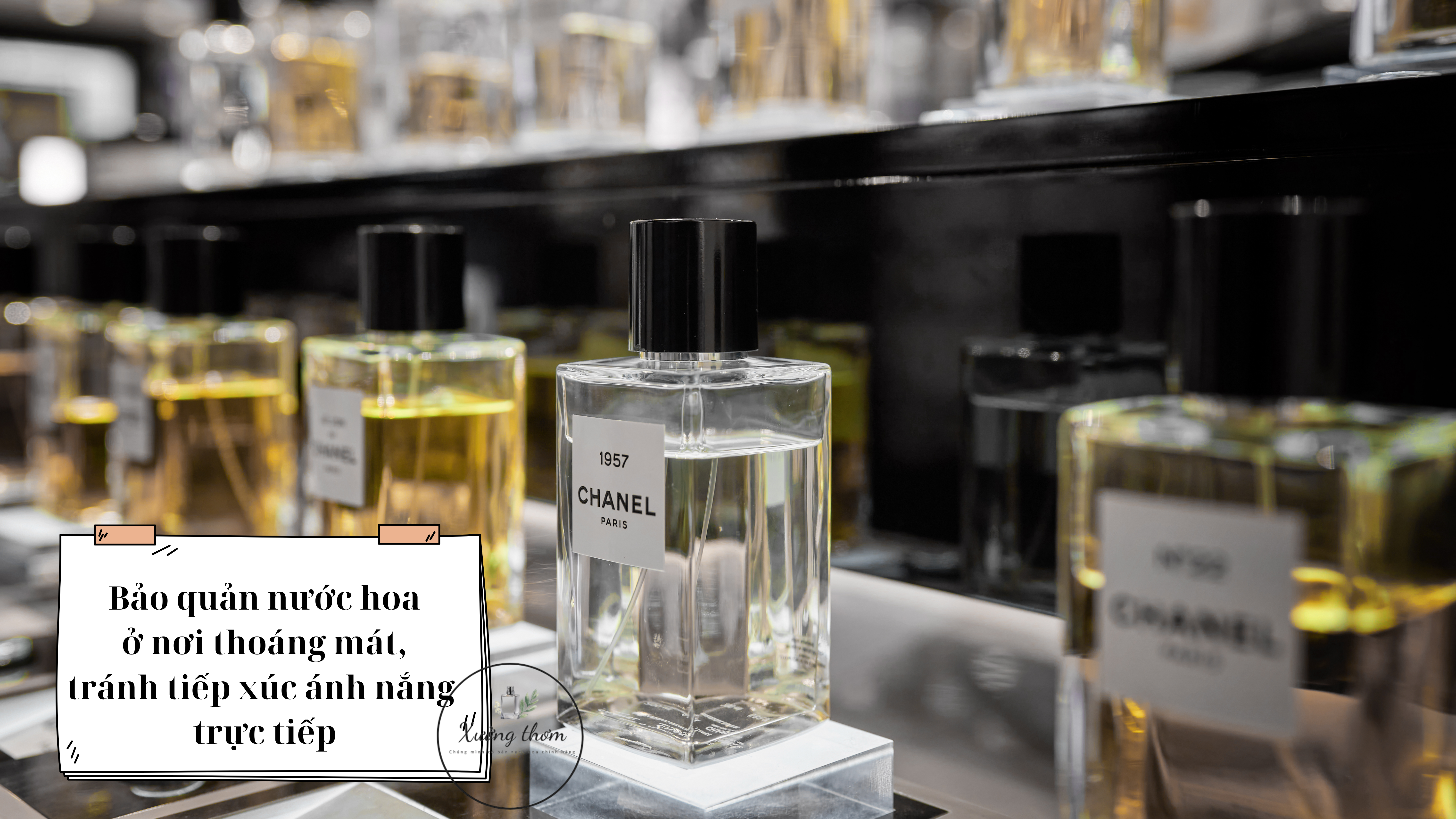 - Bảo quản nước hoa đúng cách: Bảo quản nước hoa đúng cách giúp giữ cho chất lượng nước hoa luôn ở trạng thái tốt nhất. Giữ nước hoa ở nơi khô ráo, mát mẻ và tránh ánh sáng mặt trời trực tiếp vì nhiệt độ và ánh sáng có thể làm giảm chất lượng của nước hoa theo thời gian.